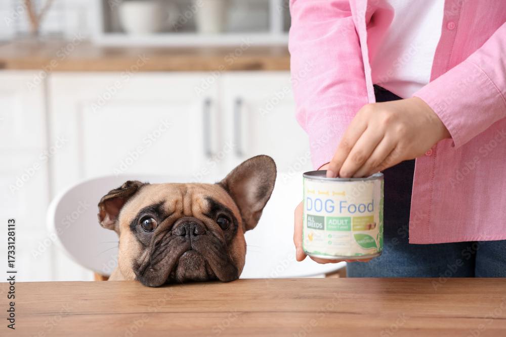 French bulldog and woman opening can with pet food at table in kitchen, closeup
