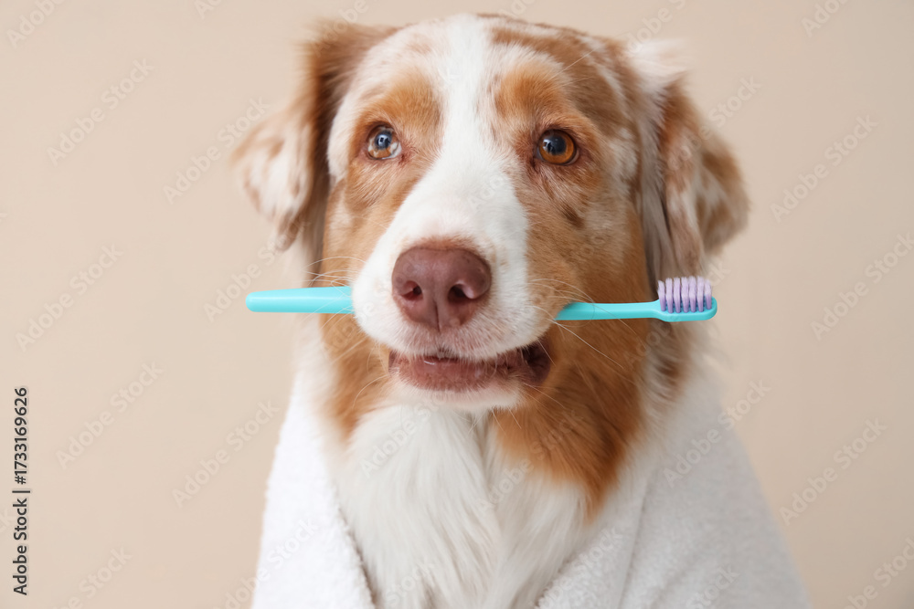 Cute Australian Shepherd dog with toothbrush on beige background, closeup. Pet Dental Health Month