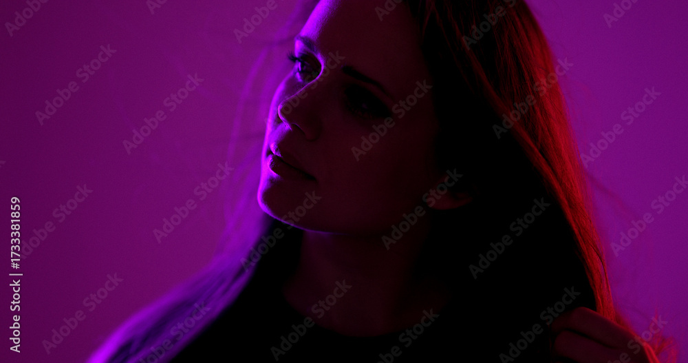 Fashion model posing with purple and red ambient lights during a studio photoshoot