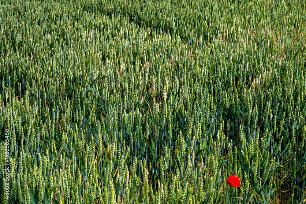 Amidst undulating waves of verdant wheat, a defiant solitary poppy whispers tales of Lammas and midsummer magic rituals April 5, 2025, Barcelona, Spain