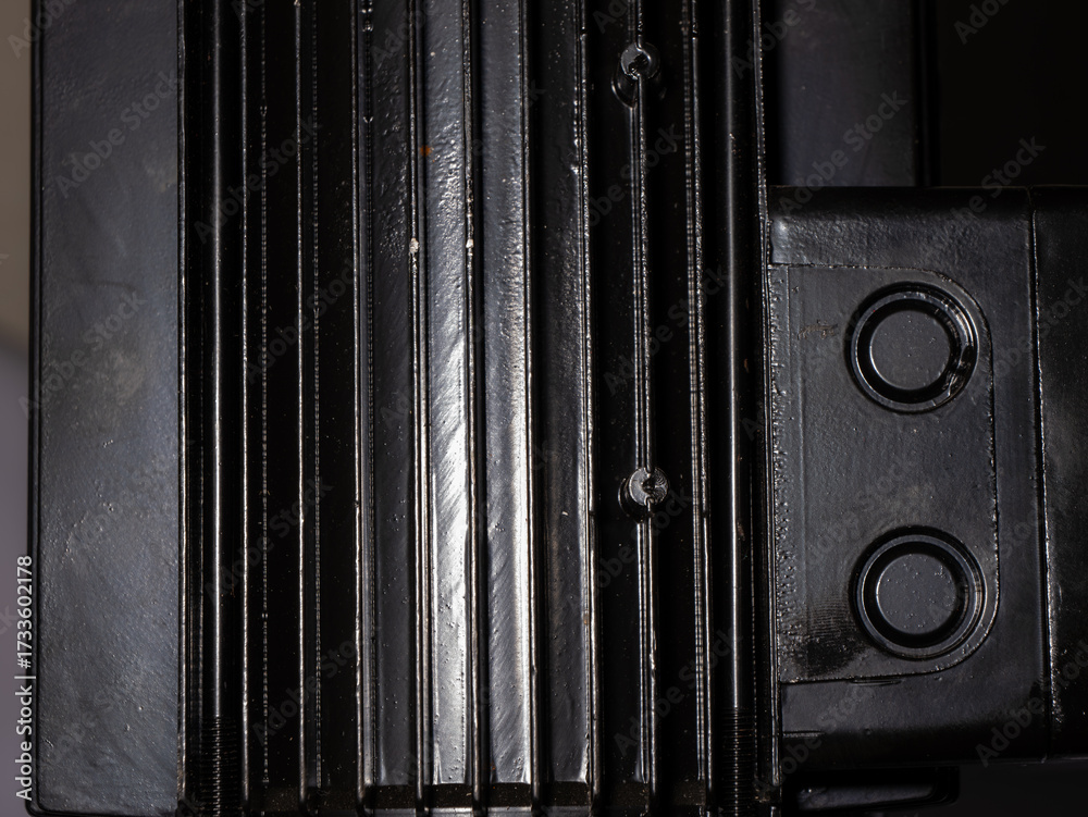A detailed close-up of an industrial electric motor casing, showcasing the black, ribbed texture of its cooling fins designed for heat dissipation. The image captures the rough, functional aesthetic o