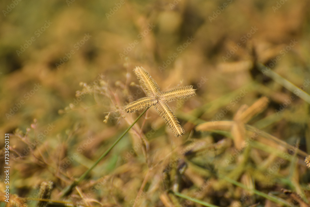 Crowfoot grass, macro shot captures the unique, star-shaped seed head of a goosegrass or crowfoot grass weed. Its spiky blades radiate out in a distinct soft-focus backdrop of green grass.