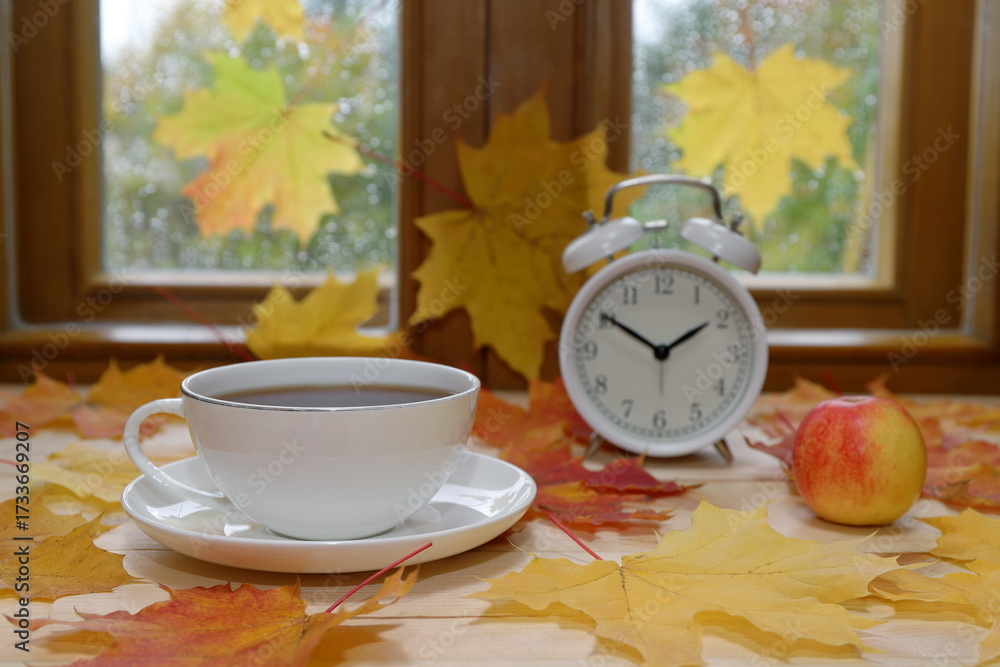 On the table among autumn foliage in front of the window, against the backdrop of a raindrops landscape, there is a cup of hot tea, next to a a retro alarm clock and an apple fruit.