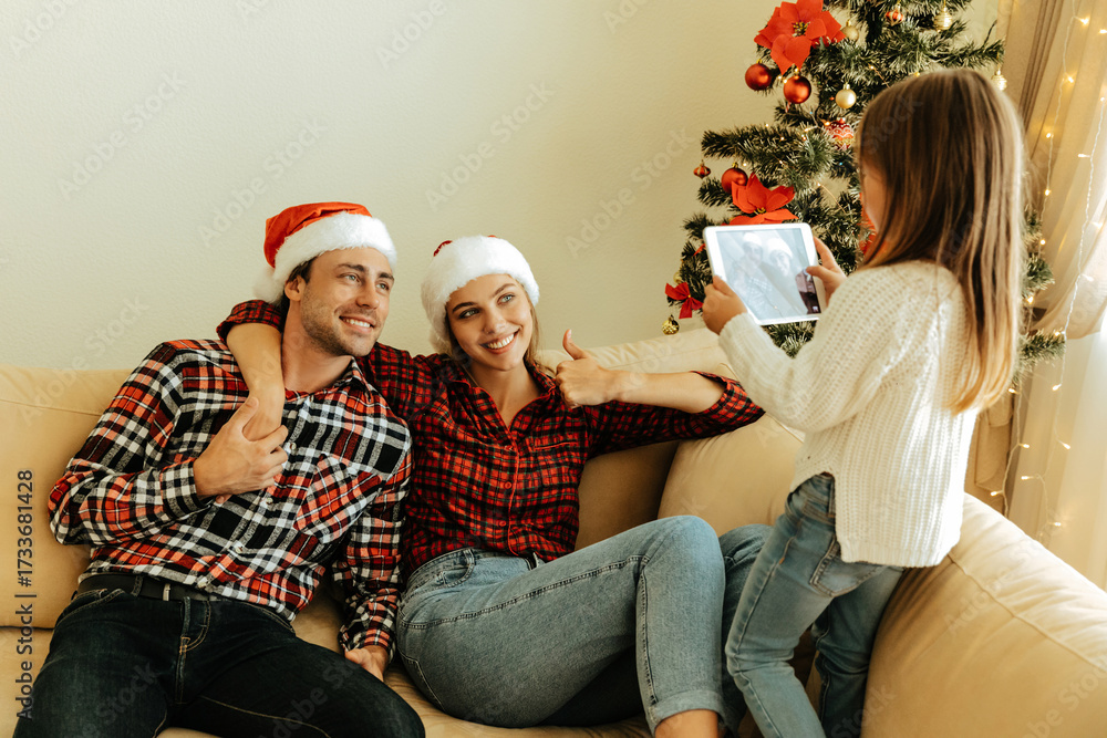 Little girl taking a picture of her smiling parents with a tablet, mother and father wearing Santa hats, sitting by the Christmas tree, enjoying festive love, family warmth, and holiday atmosphere.