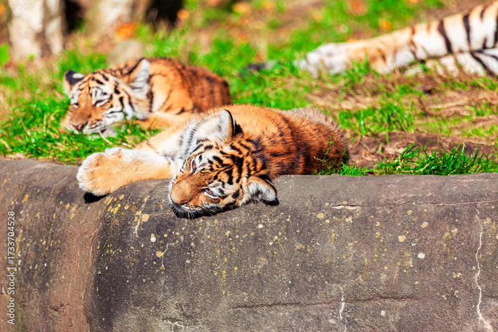 Two tiger cubs sound asleep on rocky ledge in sunshine, with their distinctive striped fur blending into warm tones of natural surroundings. Tigers resting its front paws over a grey stone ledge