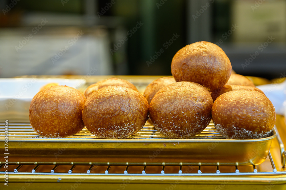 쟁반 위에 설탕이 묻어 있는 찹쌀빵