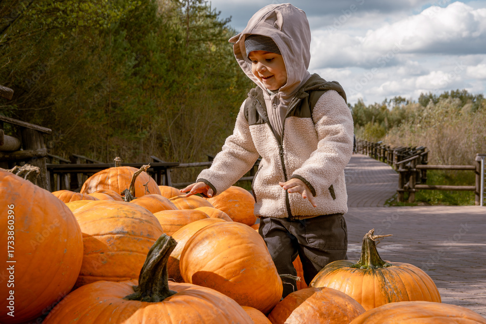 Pumpkin fun, happy child among large pumpkins on a sunny autumn day