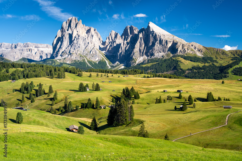 view on Alpe di Siusi meadow with small wooden cabin in Dolomites in Italy