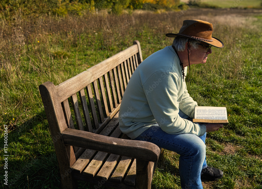 Elderly man wearing a leather hat reading a book on a park bench in warm evening sun contemplating life