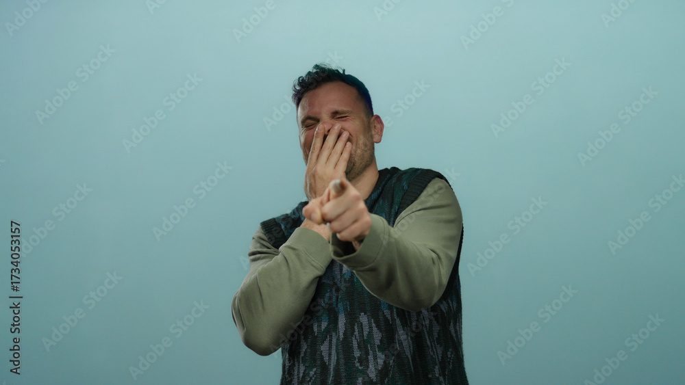 Young man laughing with hand over face and pointing, set against a solid blue background, exuding charm and playfulness while wearing casual attire.