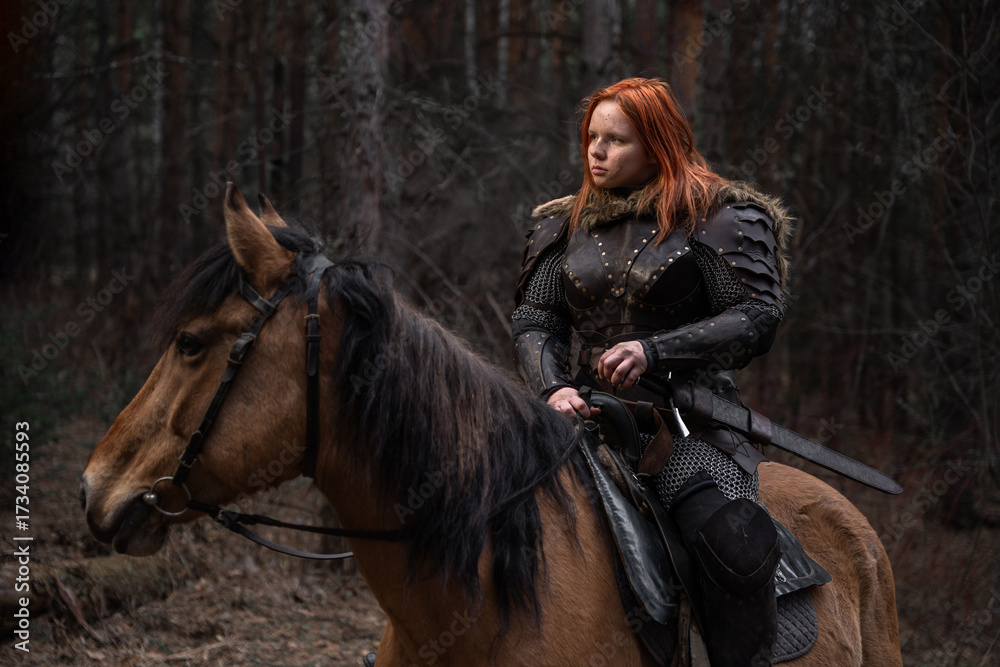 Red-haired warrior rides majestic horse through dark forest, evoking fantasy and strength.
