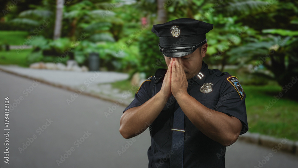 Young chinese man in police uniform on street holds palms pressed together with serious expression; duty.