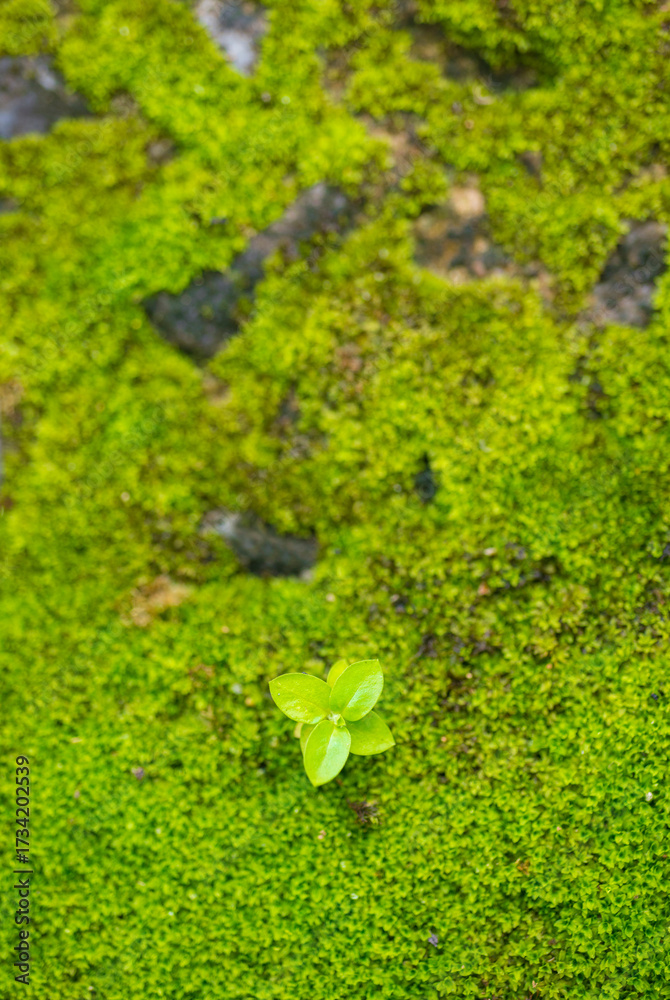 Green plant growing on mossy stone wall, nature background,