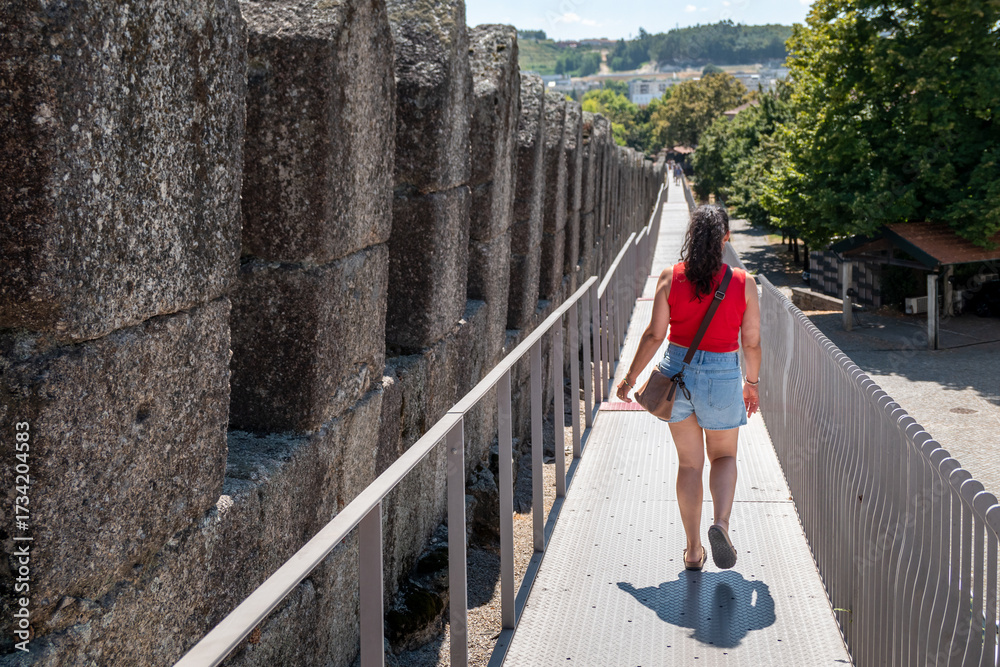 Caminhada solarenga sobre o Adarve da Muralha medieval de Guimarães, mostrando uma turista a percorrer o passadiço moderno junto ao antigo muro de pedra, com vegetação e paisagem urbana ao fundo