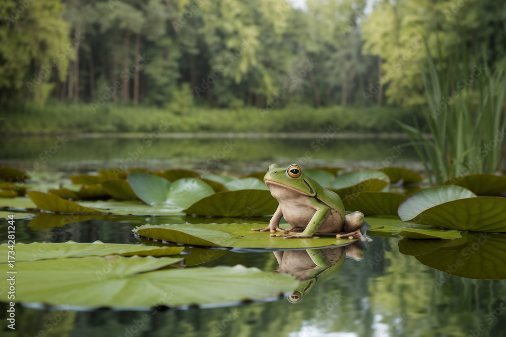 A vibrant green frog rests on a lily pad in a pond, partially submerged with its reflection visible in the dark water.
