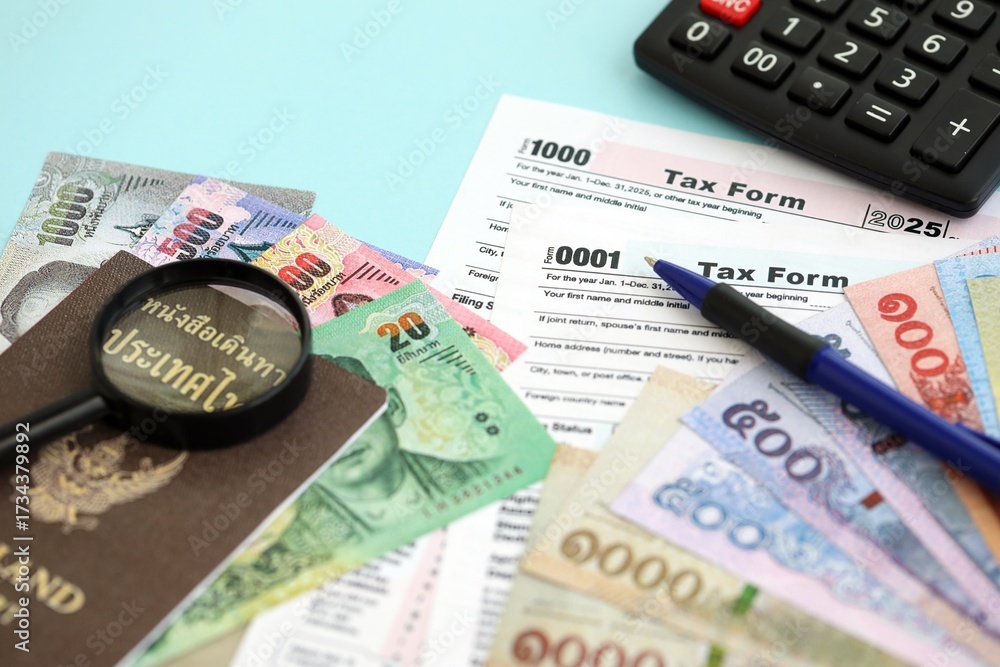 Thai baht money bills and calculator with tax form on blue. Taxation and accounting concept