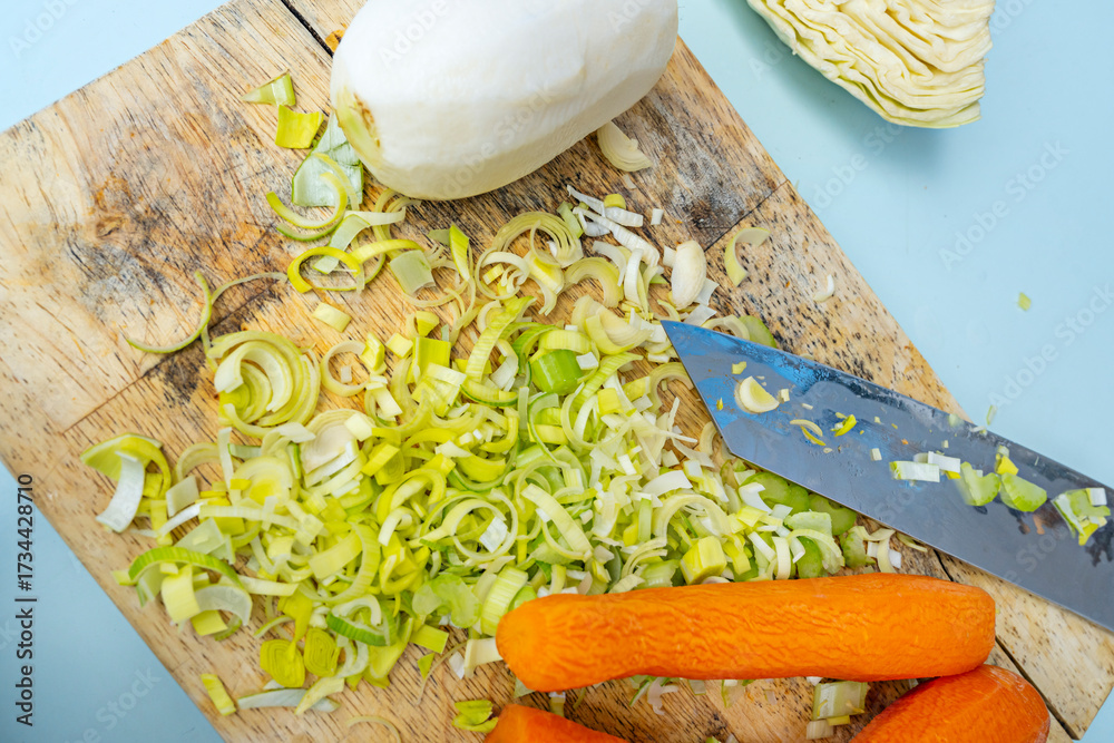 Cherry wood board on a light blue surface, with diced turnips, sliced carrots, and chopped chives for vegetable stew