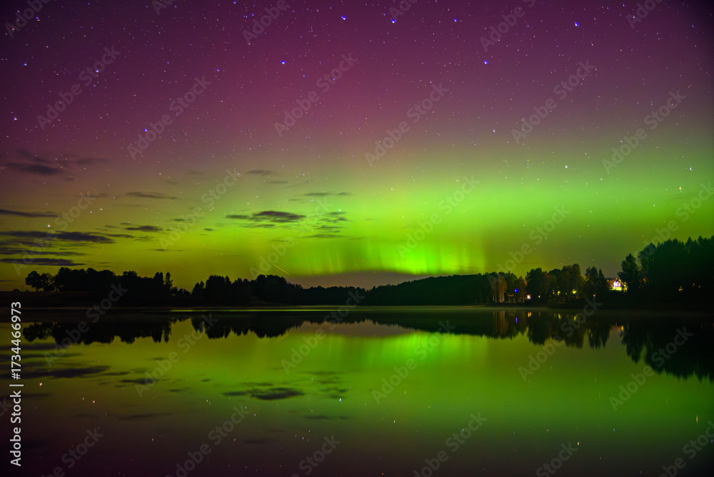 Brilliant green and purple aurora glows across the night sky, reflecting on the calm lake surface with stars shining above and trees on the horizon.