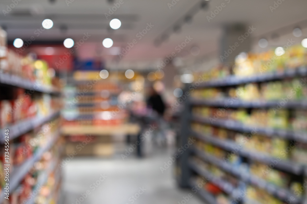 blurry background shot of a brightly lit supermarket aisle with shelves full of products and a distant shopper with a cart. ideal for topics like commerce and retail