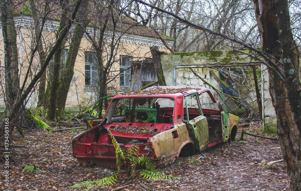 Desolate scene in Chernobyl Nuclear Zone - Rusting, stripped car and decaying building surrounded by lush overgrowth under an overcast sky.