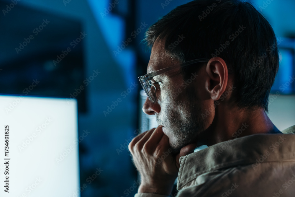 Caucasian web developer and IT support specialist coding in dark office, working on cybersecurity, hacking prevention and cloud computing.