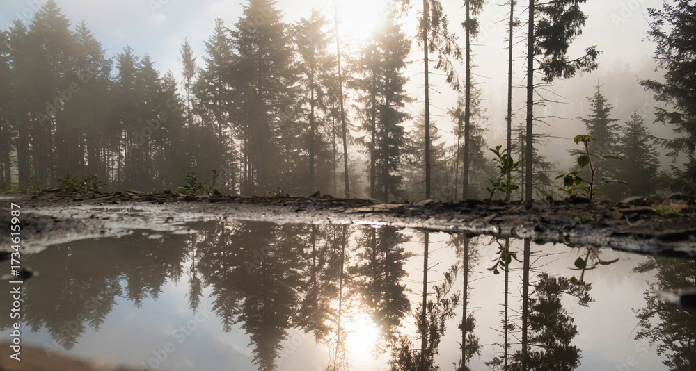 Beautiful autumn in the forest. Reflection of pines in an open bog and ripples in the water.