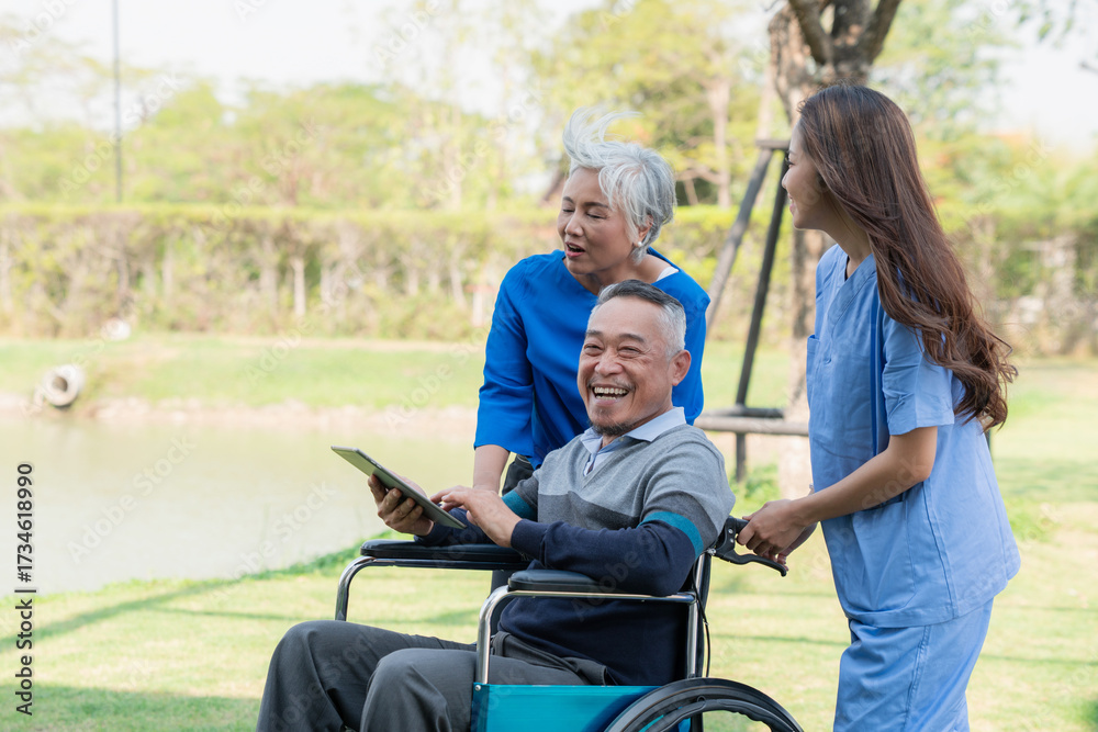 Senior man in wheelchair enjoying outdoor time with family and caregiver nurse, symbolizing elderly care, support, healthcare, nursing service, and happy retirement life.