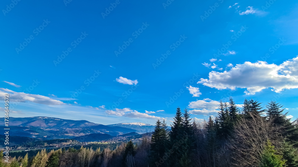 A stunning wide-angle view captures the majestic snow-capped Tatra Mountains against a brilliant blue sky, overlooking the sprawling green hills and forests near Krakow, Poland, on a clear sunny day.