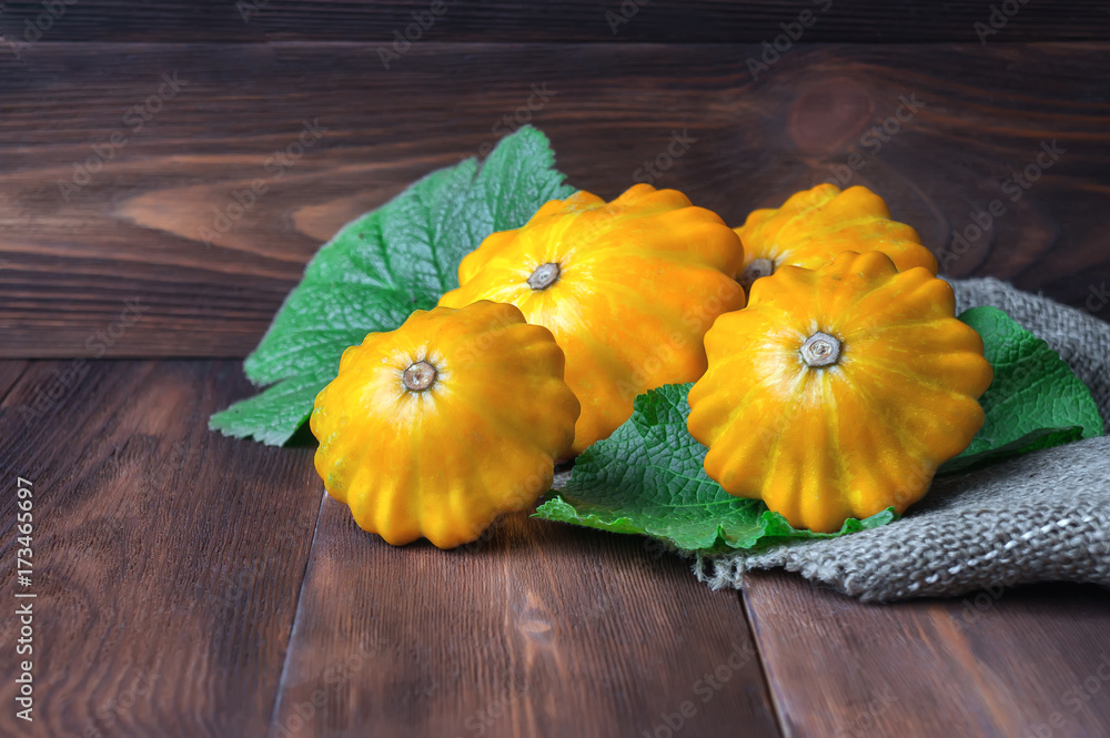 Ripe yellow pattypan squash on the wooden table, home garden. Autumn rustic food photo.