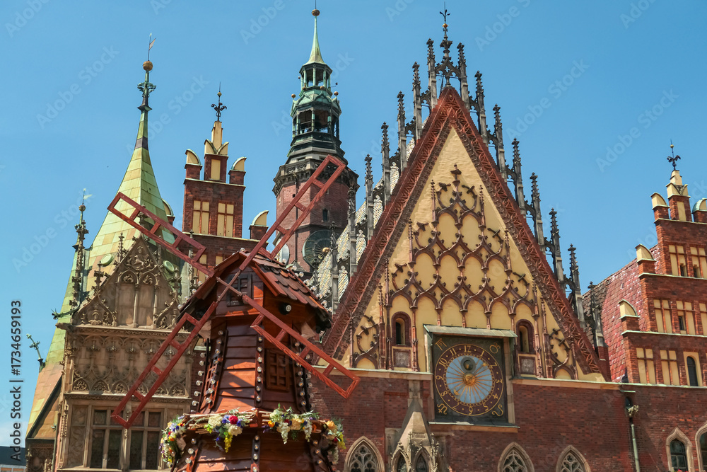 Ornate Gothic building with a colorful astronomical clock and spires rises behind a decorative wooden windmill, capturing the historic market square atmosphere of Wroclaw, Poland.