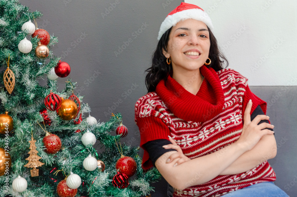 Portrait of a woman posing next to a Christmas tree.Christmas holiday concept.