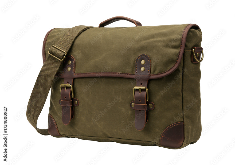 Olive green canvas messenger bag isolated, leather trim satchel with shoulder strap for work or travel