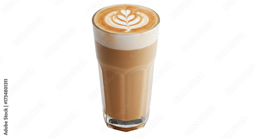 Tall glass of latte with latte art isolated, delicious coffee beverage on transparent background