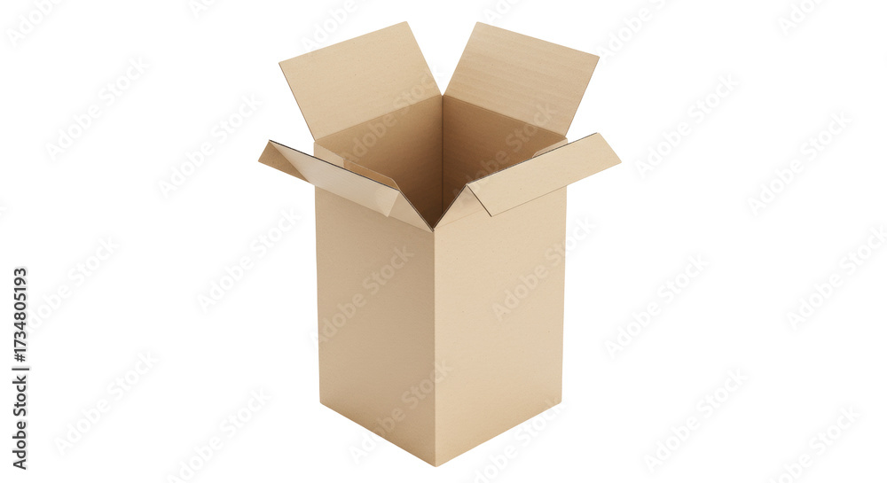 Open tall cardboard box isolated on white, brown container for shipping and storage