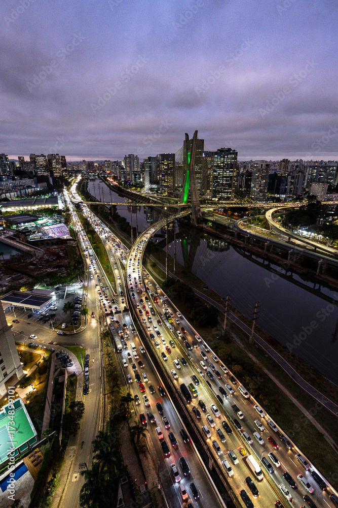View of marginal of pinheiros river during rush hour at dusk with a view of the cable stayed bridge in the background. Sao Paulo, Brazil