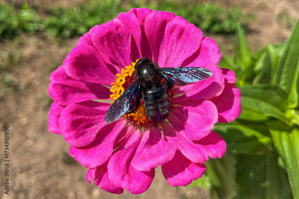 Black carpenter bee collecting nectar from a vibrant pink zinnia flower on a sunny day.