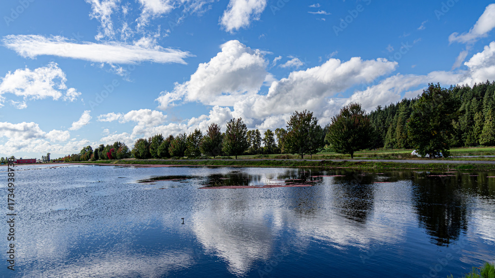Beautiful cranberry fields flooded for seasonal harvest time in Pitt Meadows British Columbia Canada