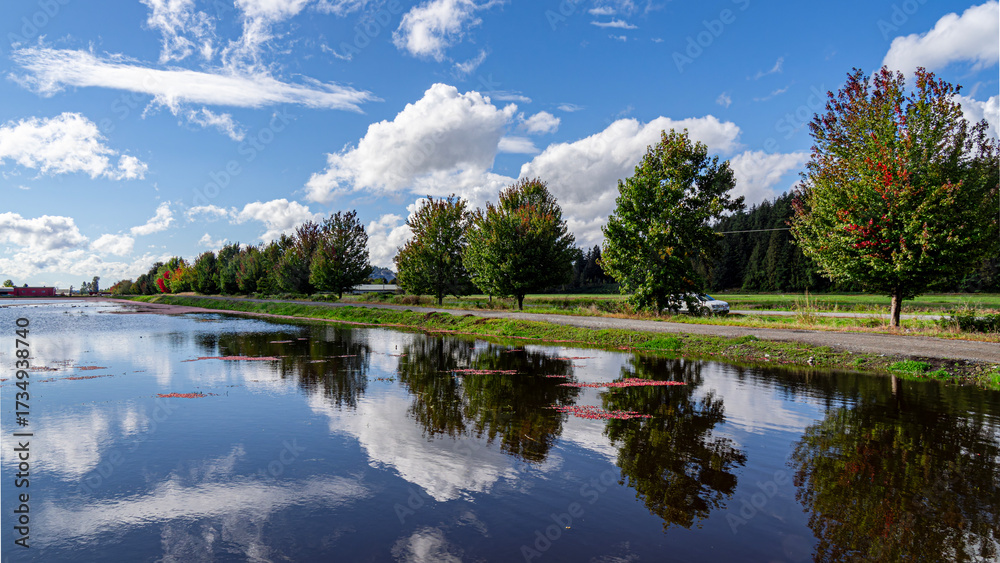 Beautiful cranberry fields flooded for seasonal harvest time in Pitt Meadows British Columbia Canada