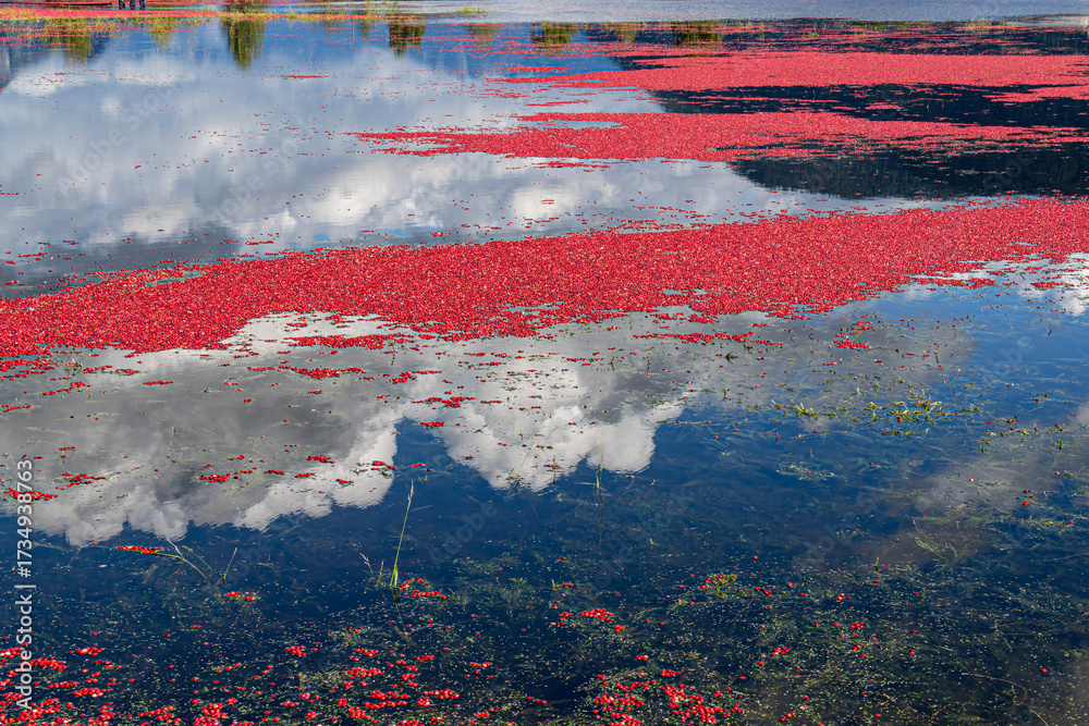 Beautiful cranberry fields flooded for seasonal harvest time in Pitt Meadows British Columbia Canada