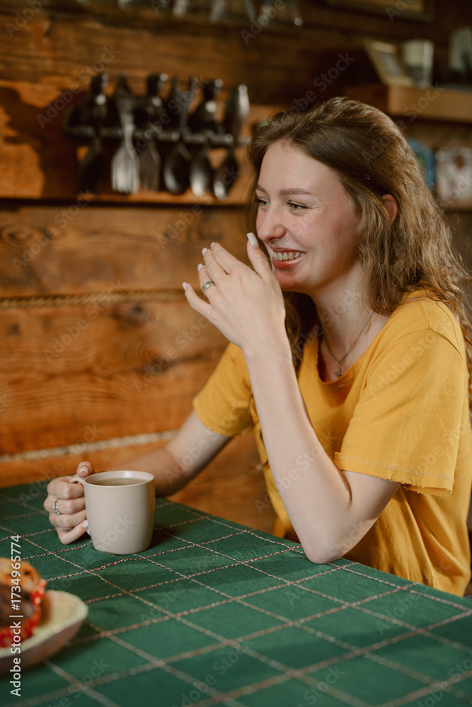 A woman wearing a yellow shirt laughs as she sips her hot drink at a wooden table. Delicious cookies rest nearby, creating a warm and inviting atmosphere.