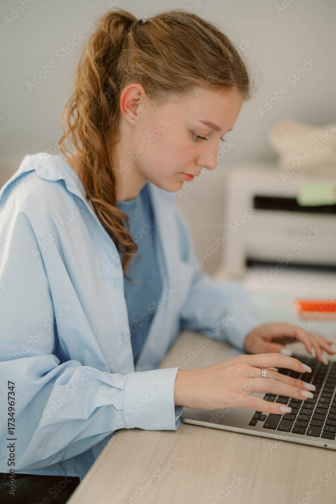 A young woman sits at a wooden desk, focused on typing on her laptop. She wears a light blue shirt and appears to be studying. The room is bright and organized, creating a calm atmosphere.