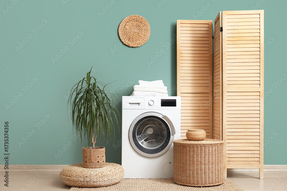 Washing machine, folding screen, houseplant and laundry basket near green wall in interior of bathroom
