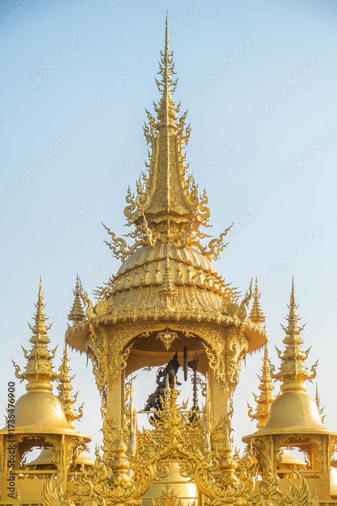 Golden Ganesha temple entrance with intricate traditional Thai architectural details and ornamental spires, Chiang Rai, Thailand. Vertical orientation. White temple complex