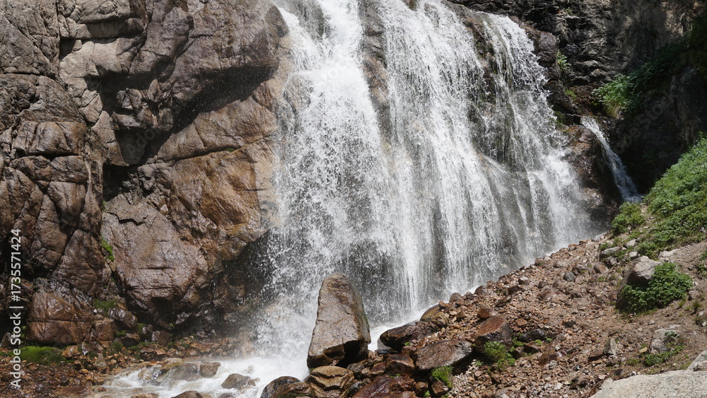 Cascading pure white water rushes down rugged granite cliffs, surrounded by dense vegetation that emphasizes nature's raw beauty and power