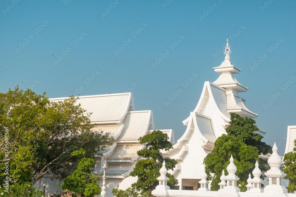 White Buddhist temple pavilion in Wat Rong Khun complex with traditional tiered roof under blue sky in sunny day, Chiang Rai, Thailand. Minimalist architecture. Travel and touristic landmark in Asia