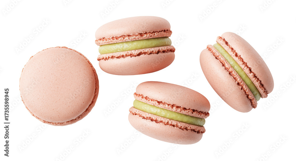 Four pink macarons with green filling isolated on transparent background, delicious French almond meringue-based confection for dessert