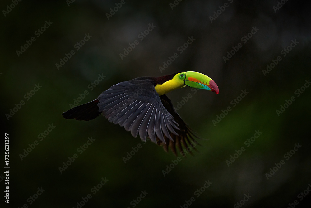 Tropic wildlife. Flying Keel-billed Toucan, Ramphastos sulfuratus, bird with big bill fly above the forest. Beautiful wildlife scene. Animal in nature forest habitat, Costa Rica.