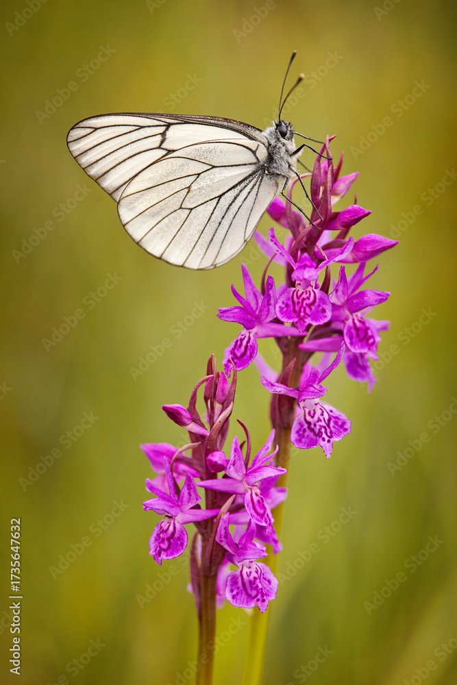 Czech Orchid, Dactylorhiza bohemica, pink wild orchid in nature habitat, detail of beautiful bloom with green clear background, Czech republic. Rare pink violet flower bloom plant on meadow, June.