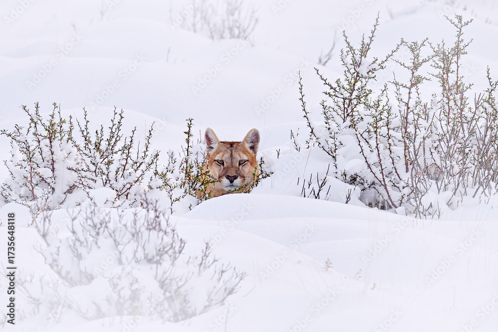 Puma, nature winter habitat with snow, Torres del Paine, Chile. Wild big cat Cougar, Puma concolor, hidden portrait of dangerous animal with stone. Mountain Lion. Wildlife scene from nature.