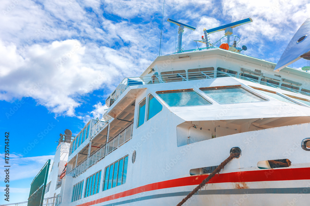 Large white ferry boat is seen from the side, prominently featuring its upper deck and bridge against blue sky with scattered white clouds. Vessel is docked or moving slowly in a port or open water